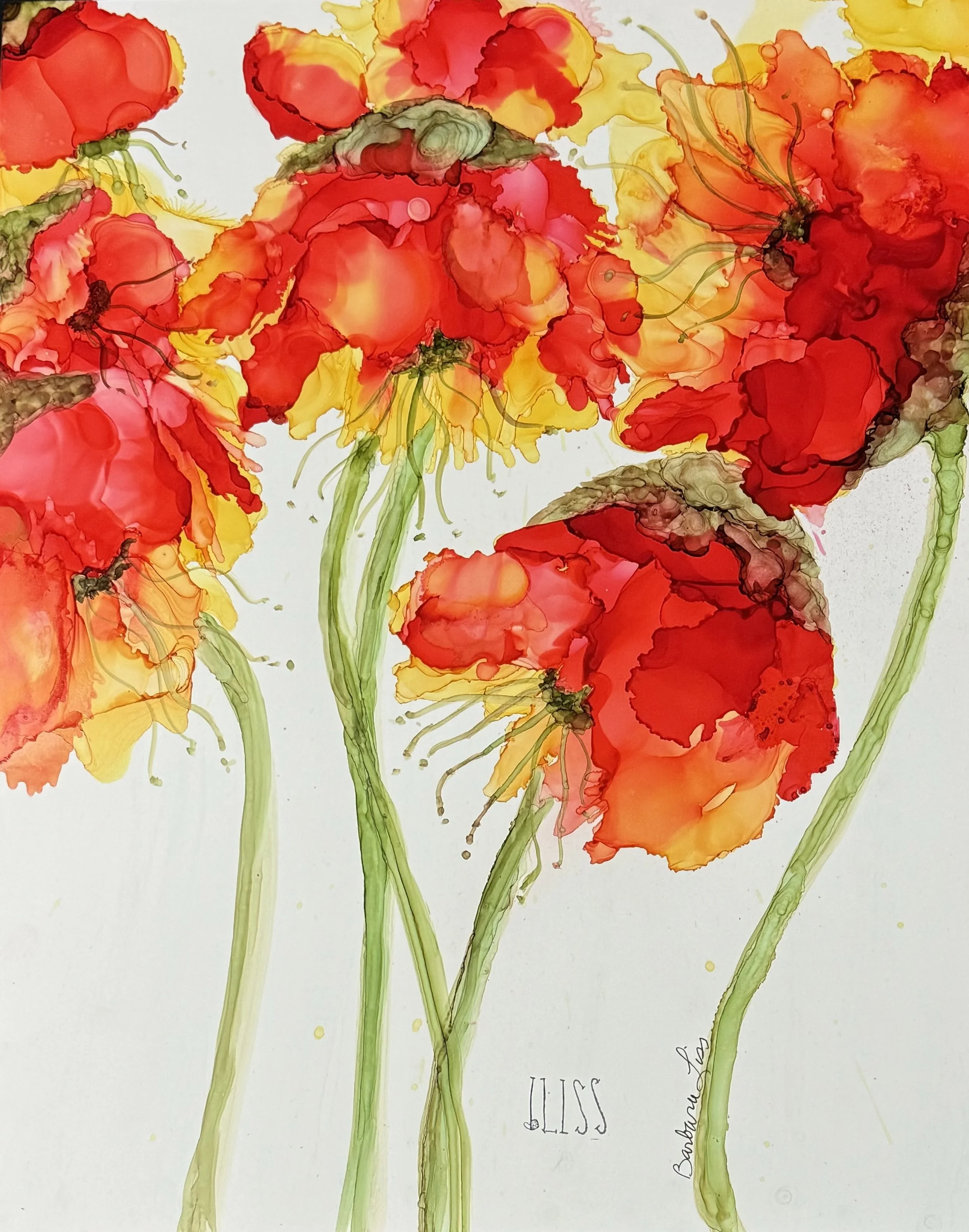 The fluidity of the medium of alcohol inks presents me with the challenge of taming it just enough for you to recognize a bloom you may have seen walking through a garden or meadow. Using surfaces that allow the inks to flow adds the graceful fell of the medium.